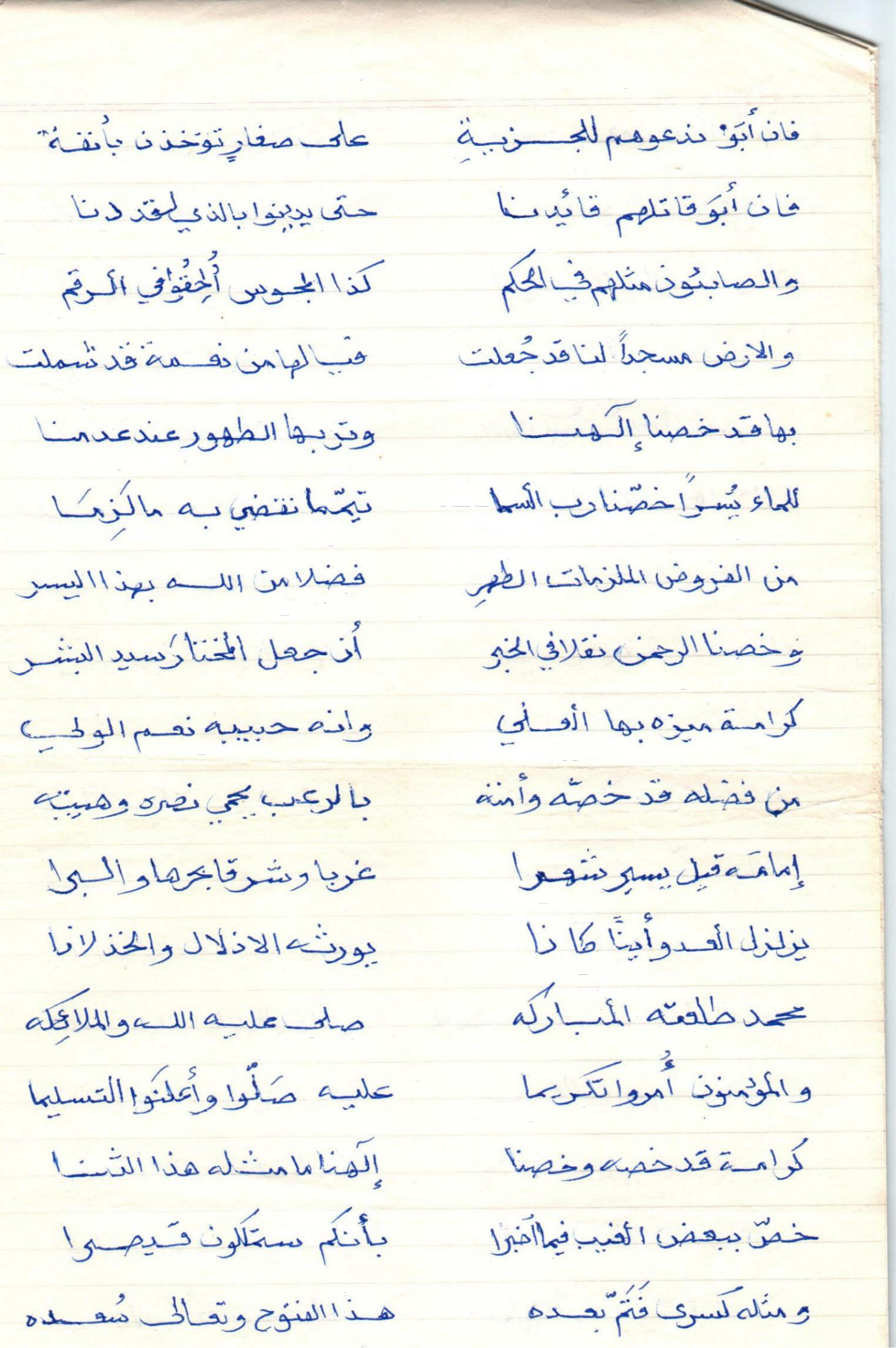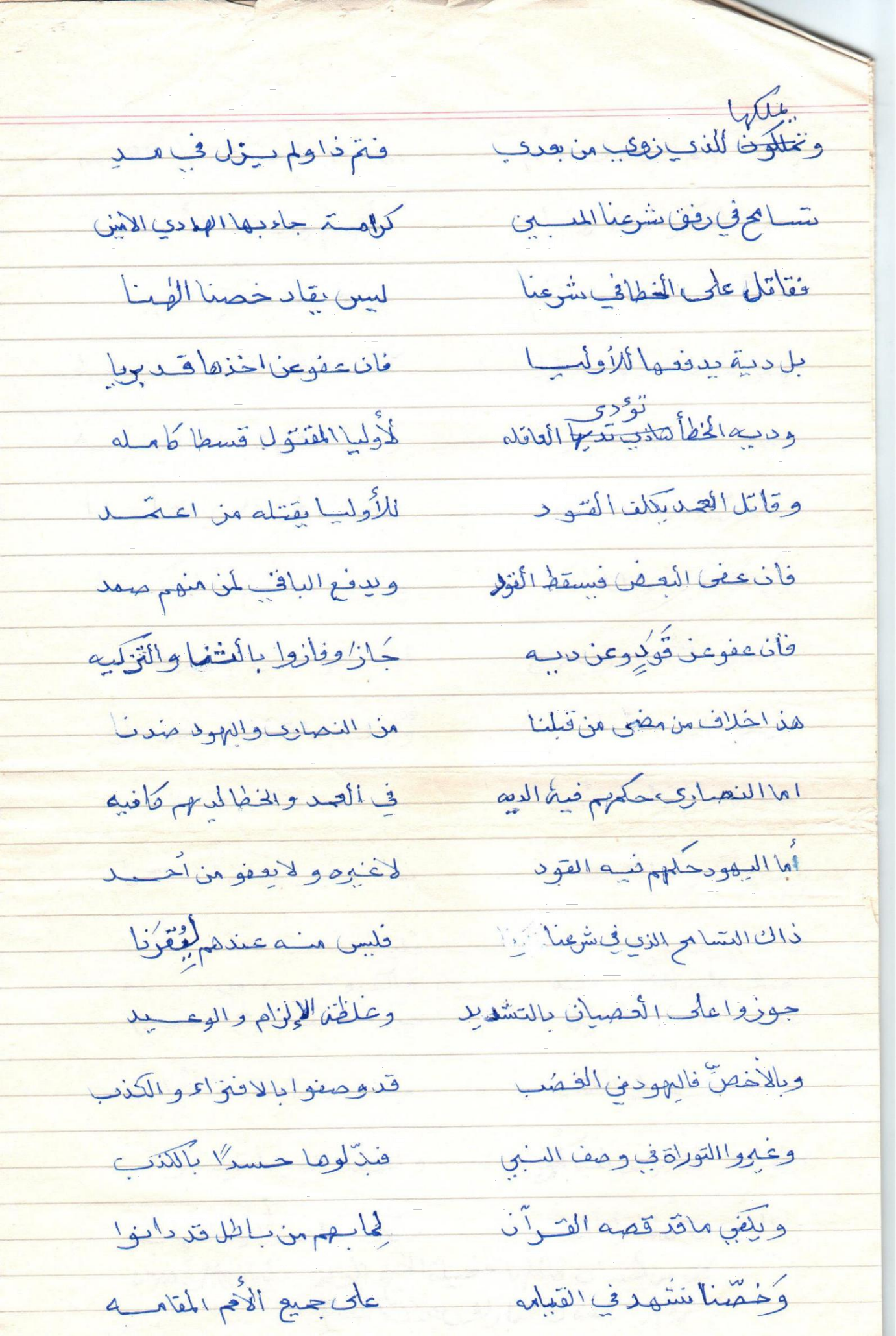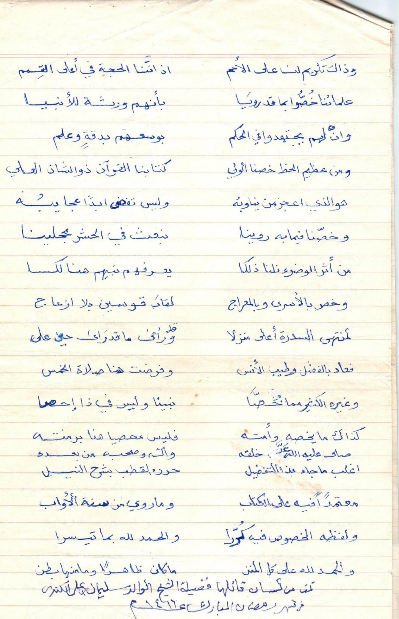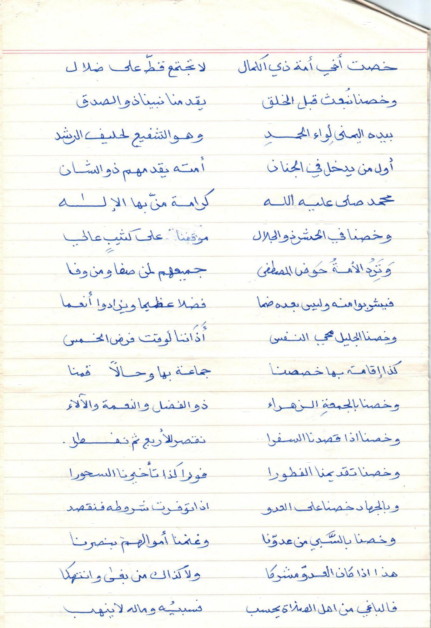 في ذكر خصوصيات النبي صلى الله عليه وسلم وأمته بسم الله الرحمن الرحيم سبحان من قد ارتدا بالكبريا سبحانه جلّ الهي وعلا نحمده بما به قد خصنا بنوره محمّد سيدنا صلى عليه الله ثم سلما وزاده كرامة وأنعما وآله وصحبه أهل الوفا وتابعيهم للنبي المصطفى وخصنا بحمده مولانا شهادة نعلنها اعلانا نشهد أن لا اله الا الله محمد رسوله اصطفاه وكل ما جاء به من ربه حق ندين بالذي جاء به شهادة تفتح باب الجنّة لمن هدي من اهل هذي الأمة...